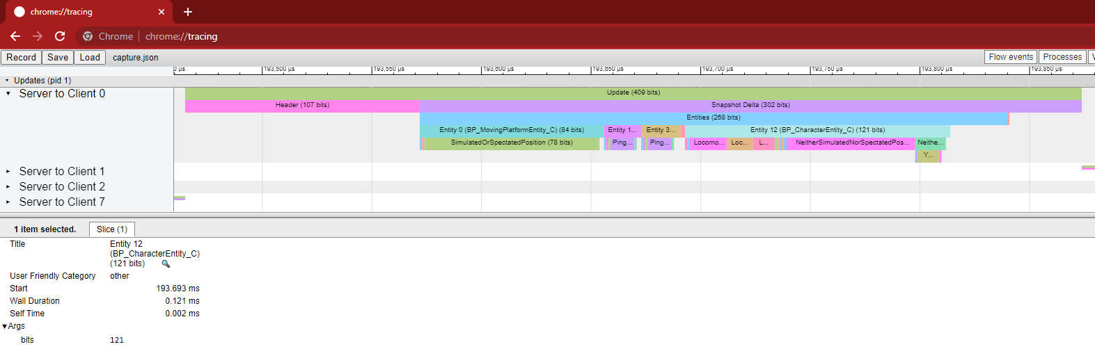 SnapNet packet captures are generated server-side and stored as JSON files. These files get large very quickly so it’s recommended to only capture for a few seconds at a time. Once generated, these capture files are designed to be viewed in Chrome Tracing. By inspecting packet captures, you can identify exactly how much bandwidth each entity and field is consuming per-client.